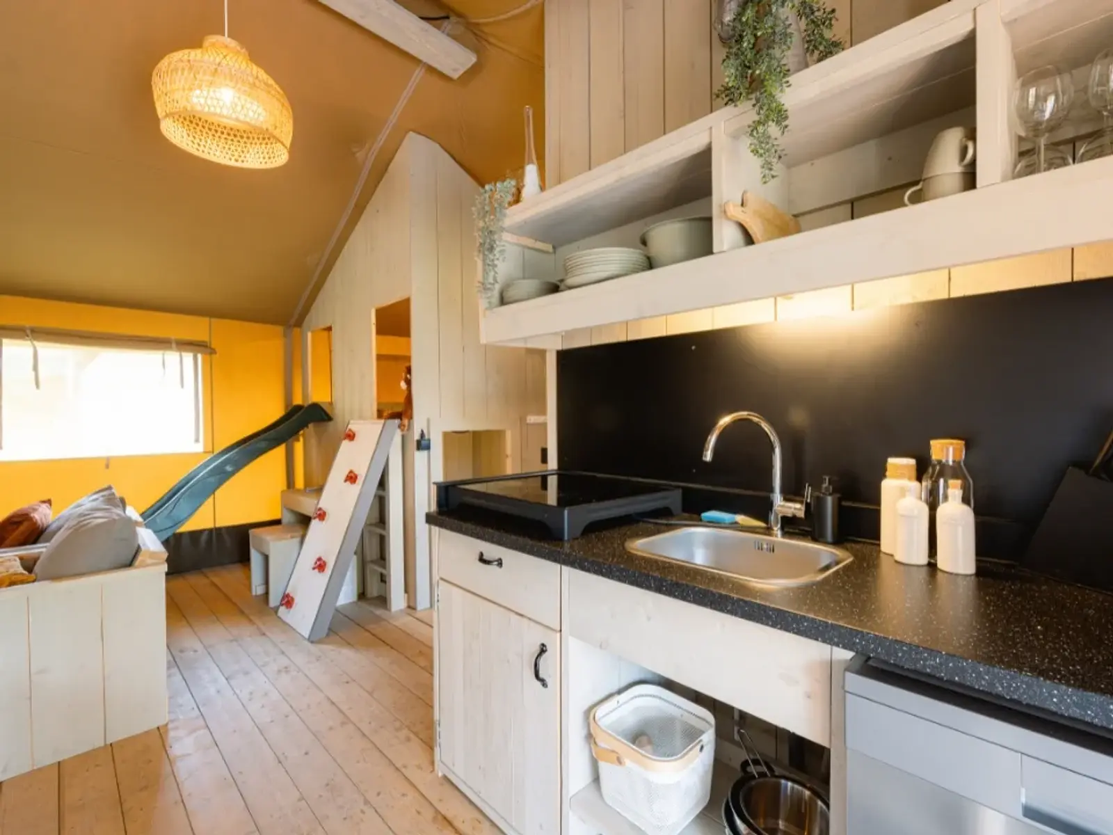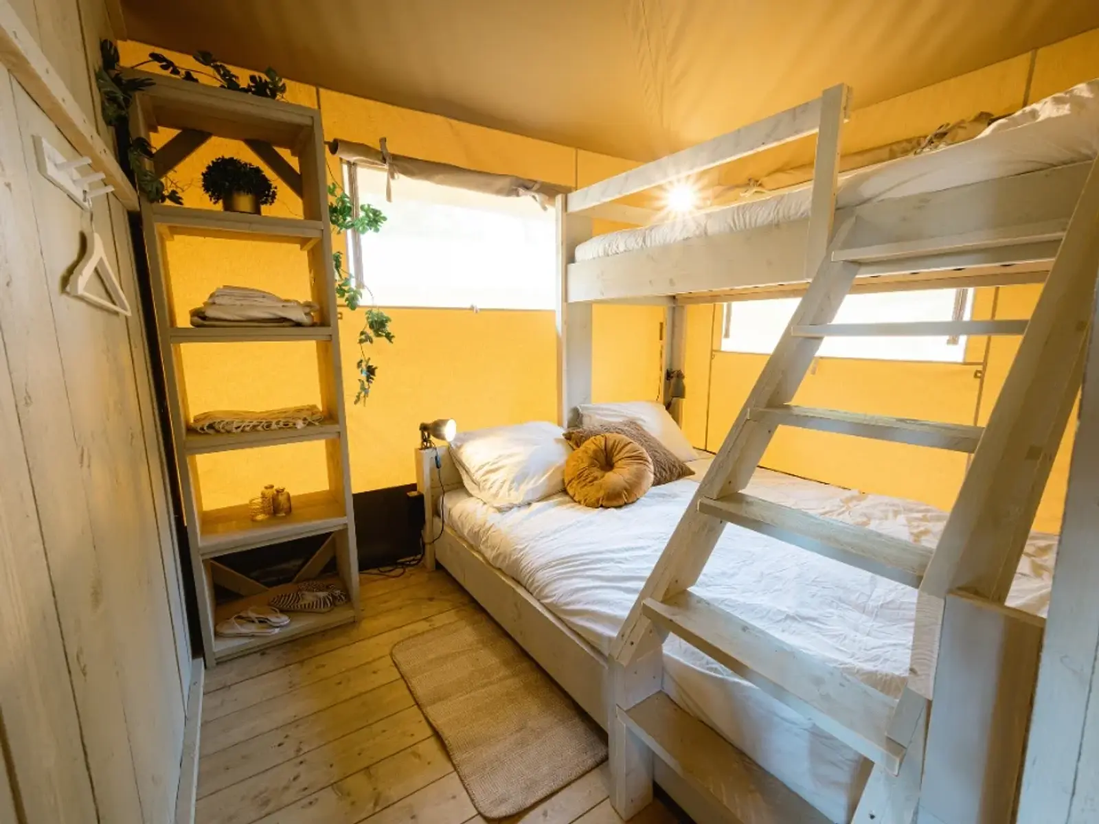 The Hoeve Tent - Family is specially designed for families of up to 7 people. Its spacious layout feels open and inviting, giving everyone plenty of room to move. Children have fun on the built-in slide and climbing wall, while parents enjoy comfort and all the conveniences of home. This tent combines a practical layout with a cozy, playful atmosphere, providing the perfect setting for a relaxing and unforgettable glamping holiday by the coast.